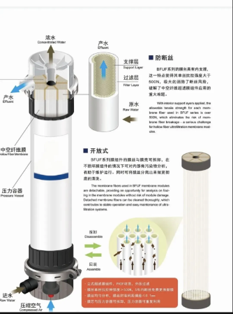 Tipo de presión interna: el agua cruda fluye desde el interior de la membrana hacia el exterior, adecuada para agua de alta turbidez.